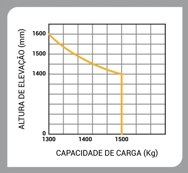 Equipamento com roda de apoio para aumentar a estabilidade ao elevar a carga, grade de proteção na torre, botão de emergência para corte geral de energia e freio estacionário mecânico.